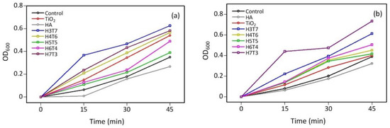 Optical density measurements of bacteria at a wavelength of 600 nm (OD 600) for (a) Escherichia coli; and (b) Staphylococcus aureus.