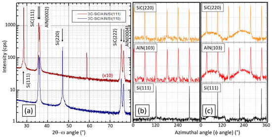Firstly, the 2θ−ω scans (Figure 1a) confirm that the 3C-SiC films were (111)-oriented, and no other crystalline direction was observed. It must be highlighted that the same orientation was conserved on the AlN films grown either on the Si(111) or Si(110) substrates.