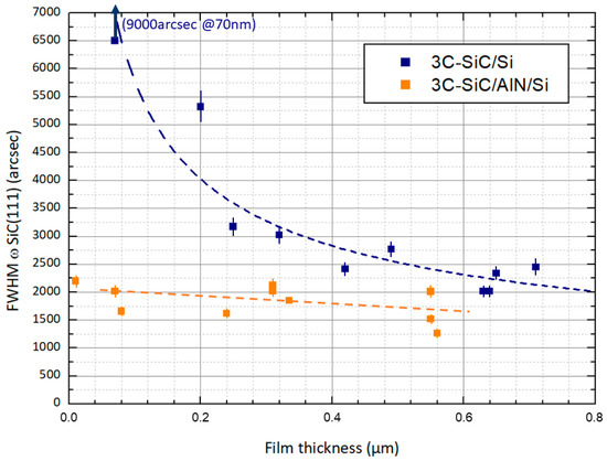 Nevertheless, the grown SiC films present an attractive feature. Indeed, Figure 3 shows the full width at half-maximum (FWHM) of the SiC(111) symmetric diffraction line as a function of the film thickness. In addition to these values, FWHMs of SiC(111) measured on SiC films grown directly on Si(111) substrates in a lab using the optimized carbonization–epitaxy growth process described in [32] are reported. We noted the very reduced values of the FWHMs for SiC films on AlN were thinner than—300 nm compared to SiC films on Si grown with the carbonization–epitaxy process. For SiC grown on AlN, the FWHMs remained below 2500 arcsec, even for the thinnest films, whereas a very strong broadening of the SiC(111) FWHMs for SiC on Si was observed for thicknesses below 200 nm. This confirms that, according to the very reduced lattice mismatch between SiC and AlN, SiC can grow with a lower density of crystalline defects than on silicon, where the carbonization stage is required and forms, in the early stage of growth, a very defective layer for this range of thickness [9]. This point is particularly important as it shows the ability to obtain a 3C-SiC film of low thickness with crystalline quality is, by far, better than using only Si as the substrate. This should be very beneficial for the design of microelectromechanical structures where the structural properties influence the mechanical properties and, thus, can potentially impact the physical parameter of devices [5,6].