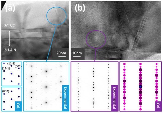 TEM observations allowed us to go a step further in the analysis. Figure 4 shows two TEM cross-section images of the interface between SiC and AlN along the <1-10> SiC zone axis. The large-scale image of Figure 4a allows for observing the presence of numerous stacking faults. The formation of stacking faults is a very likely mechanism in 3C-SiC, according to the very low energy of formation, and it is largely reported during growth on silicon. The presence of twins is also confirmed by the good match between the simulated selected-area electron diffraction (SAED) patterns, obtained by assuming the existence of twinned domains, and experimental ones (see the inset in Figure 4a). Zooming in on the SiC/AlN interface (Figure 4b) reveals that many SiC zones close to the interface presented a hexagonal arrangement, which appeared as a 6H-SiC polytype, as evidenced by their diffraction patterns (inset in Figure 4b). These zones can expand some tens of nm away from the interface.