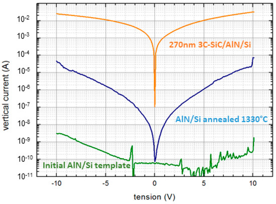 After annealing, a significantly higher current was recorded through the AlN/Si heterostructure. This trend was further enhanced when considering the complete 3C-SiC/AlN/Si heterostructure, with an ohmic character of the I(V) characteristics and current values seven orders of magnitude higher than in the case of the initial AlN/Si template, evidencing a vertical current flowing through both SiC and AlN.