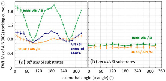 For the AlN grown on off axis substrates (Figure 7a), a strong anisotropy of the recorded values, dependent on the azimuthal angle, with two FWHMs maxima separated by 180° and corresponding to the [11,12,13,14,15,16,17,18,19,20] crystalline direction (i.e., the off-cut direction), was observed. The realization of either thermal annealing at 1330 °C or a CVD SiC growth process on such AlN films led to a significant evolution of the FWHMs. This was especially true for the off axis heterostructures (Figure 7a) for which FWHMs were reduced along the crystalline directions previously exhibiting the largest values. We observed that this effect was less pronounced after the simple annealing compared to after the SiC growth process. We also noted that only a slight evolution was observed for the crystalline directions initially presenting the lowest FWHMs ([1-100] and [-1100]). On the other hand, the decrease in the FWHMs was less pronounced (within 10%) in the case of the on axis heterostructures, for both the Si(111) (see Figure 7b) and Si(110) substrates.