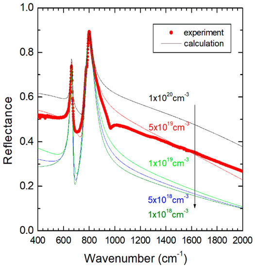 FTIR experimental reflectance spectra of materials or stacked heterostructures can be modeled by a classical dielectric model, where reflectance can be calculated from both the definition of the dielectric functions of each material present in the stack and the Fresnel coefficients at each interface [36,38]. The presence of free carriers (and, thus, doping) can significantly affect the reflectance spectrum and can be modeled by introducing a plasmon term (Drude term) to the dielectric function of the material. This Drude term is well separated from the lattice contribution (vibrations), which are described with a Lorentzian term. Thus, a qualitative assessment of a possible cross-doping effect could be carried out by comparing the experimental data with a simple dielectric calculation where we assumed different carrier concentrations. In the present work, a home-made code under a SCILAB environment [39] was used for calculating the dielectric–based reflectance of a 3C-SiC/AlN/Si heterostructure, taking as phonon parameters those reported in the literature [37,38] and considering a plasmon term, both in the SiC and in the AlN layers, as variable parameters, ranging from 200 to 2200 cm−1 for targeting carriers concentrations of 1018, 5 × 1018, 1019, 5 × 1019, and 1020 cm−3. In addition to the experimental data, Figure 8 shows the calculated reflectance spectra obtained with these different doping levels. The background, against which the SiC and AlN phonon-related peaks are observed, was soundly enhanced by the introduction of plasmon terms. For obtaining a qualitatively good agreement between the experiment and calculation, a carrier concentration roughly in the mid-1019 cm−3 was required. Obviously, our approach remains a rough estimation, as our model cannot take into account the presence of carrier concentration gradients at the interfaces or inside layers. From an experimental point of view, these gradients are very likely to occur, as cross-doping should generate diffusion mechanisms. At first, the calculated reflectance spectra show trends that support the presence of a noticeable cross-doping effect, at quite a high level, between the SiC and AlN. Further experimental data are required to go further into detail on this point.