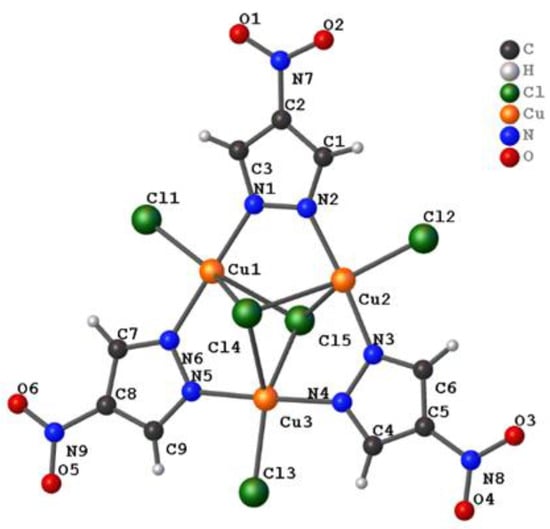 Trinuclear copper pyrazolato complexes of the general formula, [Cu3(µ3-E)(µ-4-R-pz)3X3]z, where E = OH, O, (Cl)2, (Br)2, and OMe; R = H, Cl, Br, I, Me, NO2, -CHO, and -COOEt; X = Cl, Br, PhCOO-, py, SCN-, and MeCOO-, and z = 2−, 1−, and 2+, have been studied in our laboratory for over two decades for their interesting magnetic, structural, and electrochemical properties [13,14,15,16,17,18,19,20,21]. The capping ligand E forces the Cu3E motif into one of three geometries: planar (Cu3O), trigonal pyramidal (Cu3(OH)), or trigonal bipyramidal (Cu3X2).