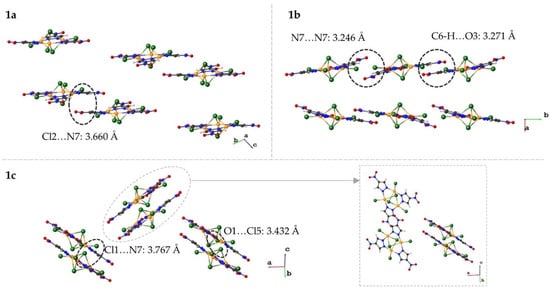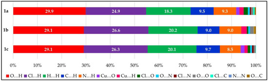 For all three polymorphs, approximately 93% of all interactions of the complex surface consist of five types: O…H, Cl…H, H…H, C…H, and N…H. There are small differences in the percentages of these interactions, as shown in Figure 9. The remaining interactions account for 2% of the interactions of each polymorph, and the same type of minor interactions do not occur for each polymorph. For example, 1b has no Cu…O interactions or Cl…N interactions and is the only polymorph that contains N…N interactions. Only 1a had Cl…C interactions. 1c had no O…C interactions.
