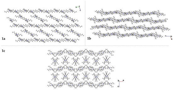 The crystal packing of the tetrabutylammonium cations for each molecule are shown in Figure 4. In each polymorph, layers of chains are formed. In 1a, the chains are approximately linear, running alternatingly parallel to the b-axis and diagonally in the bc plane. The dianionic copper complexes occupy the spaces formed between the diagonal cation chains. The cations in 1b form sinusoidal waves that propagate parallel to the c-axis; the adjacent layers of cation waves are out of phase. The complex anions occupy the channels created by layers of waves. The cations in 1c form corrugated layers parallel to the a-axis. Between consecutive layers are pairs of crystallographically non-independent cations. Four complex molecules surround each pair of cations between the layers.