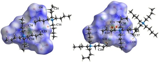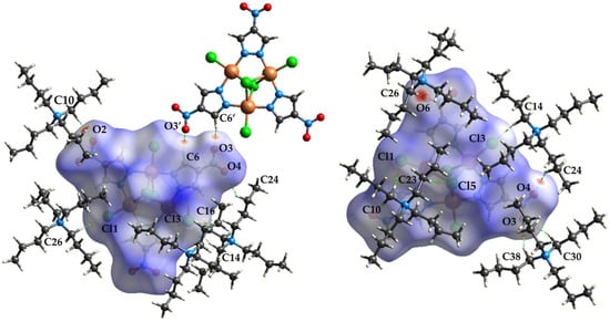 Hirshfeld surface of the front (left) and back (right) of the [Cu3(μ3-Cl)2(μ-4-NO2-pz)3Cl3]2− unit of 1b showing the intermolecular interactions with the tetrabutylammonium cations and other Cu3 dianionic complexes.