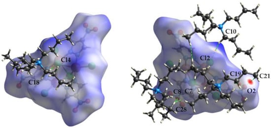 Geometric calculations and visual representations of the molecules were obtained from both Olex2 [32] and Mercury 2020.3.0 [33]. Hirshfeld surfaces, fingerprint plots, and the associated images were calculated and obtained using CrystalExplorer17 [34]. Hirshfeld surface analysis and the capabilities of CrystalExplorer are well discussed in the literature [35,36,37,38].