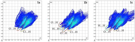 2D fingerprint plots (di/de) of 1a (left), 1b (middle), and 1c (right) showing the types of shortest interactions for each Hirshfeld surface.