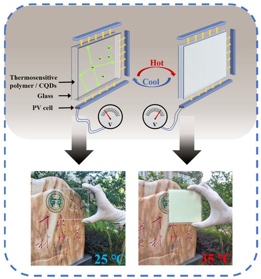 In this work, a thermoresponsive laminated LSC-SW was created by introducing CQDs into a laminated LSC filled with an aqueous thermosensitive polymer (PNIPAm) solution. The LSC-SW could be dynamically switched at transparent (<32 °C) and opaque (>32 °C) state under different ambient temperature, as shown in Figure 1. Correspondingly, high transmittance (>80%) in the transparent state and a low transmittance (<10%) in the opaque state was obtained and the power could be outputted from the PV cell on the edges [42]. More importantly, the opaque state of the LSC-SW not only led to higher external optical efficiency (ηopt of 7.49 %) but realized energy savings.