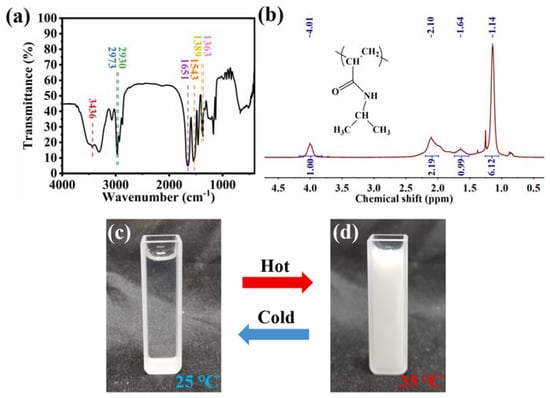 (a) FTIR spectrum of PNIPAm. (b) 1H-NMR spectrum of PNIPAm. (c,d) The optical photograph of aqueous PNIPAm solution at 25 and 35 °C.