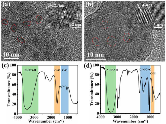 The HRTEM images of (a) B-CQDs and (b) G-CQDs. The FTIR spectra of (c) B-CQDs and (d) G-CQDs.