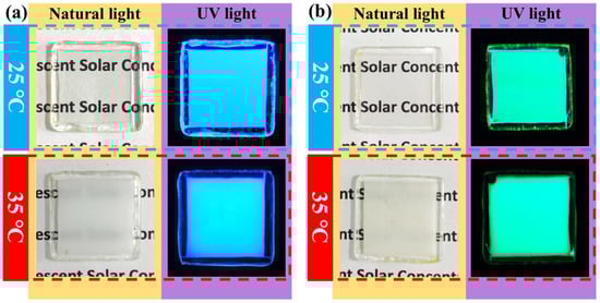 (a) Photograph of B-LSC-SW under natural light and 365 nm UV light at 25 °C and 35 °C, respectively. (b) Photograph of G-LSC-SW under natural light and 365 nm UV light at 25 °C and 35 °C.