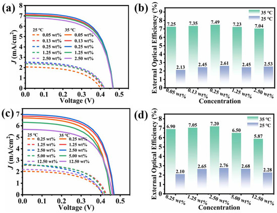 Relationship of the photocurrent density and photovoltage (J-V) of (a) B-LSC-SW and (c) G-LSC-SW with different CQDs concentration at 25 °C and 35 °C, respectively. The external optical efficiencies of (b) B-LSC-SWs and (d) G-LSC-SWs with different CQDs concentrations at 25 °C and 35 °C, respectively.