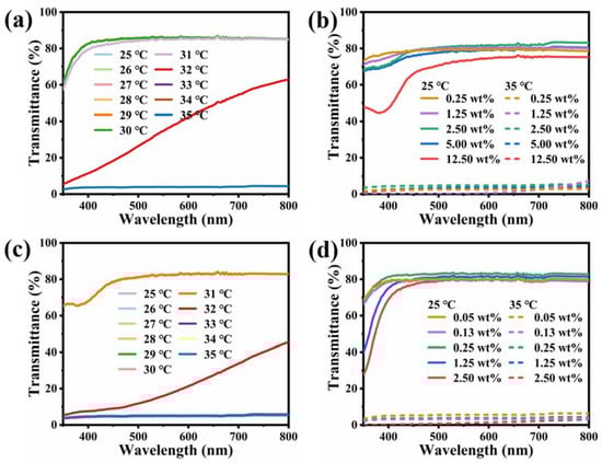The temperature response of the B-LSC and G-LSC-SWs had further been demonstrated. Figure 7a,c show the transmittance of the optimal B- and G-LSC-SWs at different temperatures. It can be seen that the transmittance of both B-LSC-SWs and G-LSC-SWs appeared the same trend: the critical point of transmittance occurred at 32 °C (Supplementary Materials Figure S6), which well matched with the LCST transition of PNIPAm [43,52]. Based on this, the transmittance of B-LSC-SWs and G-LSC-SWs with different CQDs concentrations at varying ambient temperatures (25 °C and 35 °C) had been explored (Figure 7b,d). When the temperature was lower than 32 °C, all the LSC-SWs were transparent and had high transmittance (>70%), the transmittance of the optimal LSC-SWs could reach 83%. While all the LSC-SWs turned out to be opaque and showed low transmittance (<10%) once room temperature was higher than 32 °C. Thus, the LCST transition of PNIPAm played an important role in the tunability of the transparency of LSC-SWs.