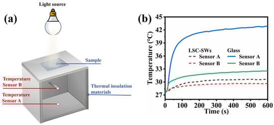 Based on the good transparency tunability of B- or G-LSC-SWs with temperature, indoor temperature monitoring had been demonstrated, as shown in Figure 8. First, an indoor temperature monitoring device based on B-LSC-SW had been built, consisting of a hollow cubic box, B-LSC-SW (10 × 10 × 0.3 cm3) as a top wall window, and two temperature sensors inside a box, as shown in Figure 8a. To avoid the effect of ambient temperature outside the box on the test data, all the box walls were wrapped with thermal insulation materials. For better comparison, a glass substrate, instead of LSC-SW, was also used as the top wall window of the box. Two temperature sensors were used to measure the indoor temperatures: sensor A measured the bottom temperature of the box and sensor B recorded the air temperature in the middle of the box, corresponding to the simulated indoor floor temperature and indoor air temperature. Figure 8b shows the temperature changes at different positions of the box with time. Under the irradiation of a standard sunlight intensity (100 mW/cm2), when the B-LSC-SW was used, the temperature slowly increased from 27.6 °C to 29.4 °C (the bottom temperature) and 28.9 °C (the middle temperature) at the beginning of irradiation time (0–80 s), respectively. After that, both temperatures were almost kept constant. After 600 s of irradiation, the bottom temperature reached 30.6 °C and the middle temperature was 29.6 °C, respectively. By comparison, when the glass substrate was used to replace the LSC window, within 0–80 s, the temperature rapidly increased from 27.6 °C to 39.4 °C (the bottom temperature) and 31.0 °C (the middle temperature), respectively. After 600 s of irradiation, the bottom temperature reached 42.8 °C and the middle temperature is up to 32.6 °C, respectively. The results showed that after 600 s irradiation, compared to that of the glass window, the LSC-SW could lead to 12.2 °C of the bottom temperature difference and 3.0 °C of the middle temperature difference, respectively. In addition, the whole indoor temperature could be controlled to be lower than 31 °C after using LSC-SWs. Thus, the LSC-SWs posed great potential in indoor temperature modulation and energy saving.