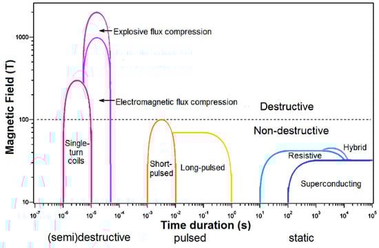 Obtaining high and ultrahigh fields, as well as obtaining reliable experimental data on the magnetization of samples, is a technically difficult task, which is the subject of great efforts of scientists from different countries as a rule. Generation of magnetic fields involves having an electric current flow through a coil, and the field intensity B is proportional to the current I. The heat dissipation I2R is proportional to the square of the magnetic field, where R is the coil’s resistance. The mechanical pressure is also proportional to B2, with a proportionality coefficient of approximately 4 atm/T2. Heating and mechanical forces are the two essential problems for the generation of high fields. The stored energy in magnetic field depends on the volume of the magnet, so the size of the field volume is also an important characteristic of the magnet. Another key parameter is whether a magnet is DC or pulsed and, in the latter case, additional important parameters are the duration, temporal profile of the pulse, and the pulse repetition rate. There are several different approaches to overcome the heat–dissipation and mechanical-stability challenges, which is demonstrated in Figure 1 [14]. In all cases, choice of materials is crucially important, so such development is a task at the intersection of physics, engineering, and materials sciences.