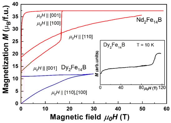 Magnetization curves of Dy2Fe14B and Nd2Fe14B single crystals applied along the main crystallographic directions at 1.8 and 10 K, respectively [18,23]. Inset: The data for an aligned polycrystal Dy2Fe14B at 10 K (for increasing fields [16]) are shown for comparison.