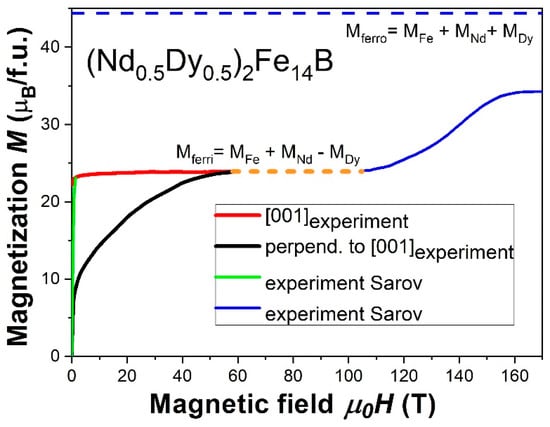 Figure 3 demonstrates the magnetization curves of the (Nd0.5Dy0.5)2Fe14B compound along the perpendicular [001] easy axis. Magnetization measurements were performed by us at the Dresden High Magnetic Field Laboratory in pulsed magnetic fields up to 58 T previously [18]. The measurements up to 170 T obtained for the first time at the Russian Federal Nuclear Center in Sarov. It should be mentioned that a compensated pick-up sensor, in fact, measured a time derivative of magnetization. This is why the flat segments of the magnetization curve in Figure 3 were beyond the sensitivity and shown by the dashed line. A partial substitution of Dy by Nd atom in the latter compound results in an increase of the anisotropy field where the easy- and hard-axis magnetization curves intersect. Such new results, containing features on the magnetization curve, can also be used for modern numerical calculations, including for obtaining or refining the exchange and crystal-field parameters in the quantum model of the crystal electric field [16,17,18].