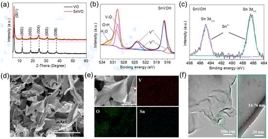 Characterization of SnVOH. (a) XRD patterns of SnVOH sample; (b) XPS spectra of (b) O1s and V 2p and (c) Sn 3d; (d) SEM of SnVOH sample; (e) EDS mapping of SnVOH sample; (f) TEM of SnVOH sample.