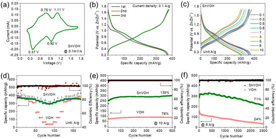 To evaluate the zinc-ion storage performance, VOH and SnVOH were mixed with the CNT solution and then, they filtered to form free-standing composite films, which were cut into small pieces and used directly as the cathode. The VOH and SnVOH nanosheets were both evenly mixed with the CNTs (Figure S4a,c), and the composite films were layered at a thickness of 40.2 and 41.7 μm, respectively (Figure S4b,d). The coin cells were assembled using the VOH and SnVOH-based cathodes and tested in the voltage range of 0.2–1.7 V vs. Zn/Zn2+. There are two pairs of redox peaks in the CV profile of the VOH-based cathode, as shown in Figure S5a. Similarly, the CV profile of SnVOH in Figure 2a shows two oxidation peaks at 0.75 and 1.11 V along with two reduction peaks at 0.37 and 0.75 V, which correspond to the multi-step extraction/insertion of the Zn2+ ion in the framework of SnVOH, respectively [37,38]. The redox reactions are consistent with the plateaus of the initial three galvanostatic charge and the discharge curves of SnVOH at 0.1 A/g in Figure 2b. The GCD profiles of SnVOH in Figure 2c show the maximum discharge capacity is 387 mAh/g at a current density of 0.1 A/g. Additionally, its capacity retention is impressive, at 77.8%, when the current density increases from 0.1 to 10 A/g. The pristine VOH shows an average discharge capacity of 395 mAh/g at 0.1 A/g (Figure 2d), which is close to that of SnVOH. However, its rate performance is unsatisfactory by possessing a dramatically lower retention of 12.6% when the current density increased to 10 A/g. The average discharge capacities of 387, 365, 349, 348, 345, 330, 321, 309, and 301 mAh/g were recorded for SnVOH at the current densities of 0.1, 0.3, 0.5, 0.8, 1, 3, 5, 8, and 10 A/g, respectively (Figure 2d). SnVOH had higher capacities than VOH did at the current densities over 0.5 A/g, and the capacity advantage is larger at a higher current density. The significant improvement in the rate performance of SnVOH can be accounted for by the highly facilitated Zn2+ diffusion in the VOH framework after incorporating the Sn element. Not only is there a dramatically enhanced rate performance, but SnVOH also demonstrates an improved electrochemical stability at both the small and large current densities, as shown in Figure 2e,f, respectively. During the cycling test at 10 A/g for 500 cycles, the capacity of SnVOH goes through a slow increasing process during the initial 100 cycles and then, it remains stable in the following cycles, while the capacity of VOH decays rapidly in the first 10 cycles, then, it slowly increases in the following 200 cycles, and stays steady in the last 300 cycles. The capacity retentions for SnVOH and VOH are 135.4% and 76.1% after the cycling at 10 A/g for 500 times, respectively (Figure 2e). During the cycling at 5 A/g for 2500 cycles, the VOH cathode undergoes fast capacity fading, leading to a final capacity retention of 24%, which is much lower than the 71% of the SnVOH cathode in the same condition (Figure 2f). In addition, the rate and cycling performance of the Sn-doped hydrated V2O5 is superior to the results from the recent research on hydrated V2O5, as shown in Table S2. The rapid capacity decay of VOH may be mainly attributed to the unstable layered structure and the dissolution of VOH during repeated insertion/extraction of zinc ions. Additionally, the enhanced cycling performance of SnVOH reveals the outstanding structural stabilizer function of the doped Sn ions.