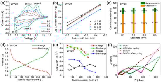 where a and b are the variables. The b value ranges from 0.5 to 1.0, which indicates a different mechanism. A b value of one is indicative of the dominated contribution of the surface capacitance to the total capacity, and a b value of 0.5 exhibits diffusion-controlled charge storage [27]. In addition, the slope of the log (i) versus the log (ν) plot can be used to estimate the b value, as shown in Figure 3b,c. The b values of the peaks 1–4 for the SnVOH electrode are 0.97, 0.81, 0.93, and 0.89, (Figure 3b), which implies the SnVOH has considerable kinetics, and its charge storage mainly comes from surface capacitance, and it is slightly influenced by the diffusion process. By fitting the C–V curves at different scan rates in Figure S5b, the b values of the peaks 1–4 for the VOH electrode are 0.85, 0.86, 0.72, and 0.96 (Figure S5c), suggesting the capacity of the VOH cathode is also influenced by both the capacitive and diffusion processes, and it is dominated by the surface capacitive capacity. Furthermore, the capacity is divided as a capacitive-controlled part (k1ν) and diffusion-induced part (k2ν1/2) which are described by the following equations [40]: