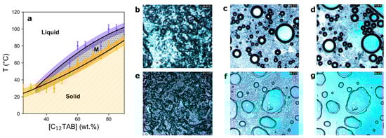 In the first instance, a phase diagram (shown in Figure 2) of C12TAB in the binary eutectic mixture of ChCl:ethylene glycol (xEG = 0.67) was constructed by visual inspection of the surfactant-DES mixtures across a wide temperature and concentration range. This allowed the determination of the solid–liquid phase boundary, below which crystallisation of the surfactant and/or DES is observed, and has previously been used to observed the same phase-richness for hexadecylpyridinium bromide in DES as in water []. The phase diagram shows a relatively high solubility of C12TAB within the ChCl:EG DES, and that any self-assembly behaviour would have a relatively low Krafft point (below room temperature), as may be anticipated for C12 amphiphiles such as this, in solvents with an appropriate Gordon parameter []. A region was observed in the phase diagram whose behaviour suggests the formation of a mesophase (vide infra); equilibrated samples at high C12TAB content formed a gel-like, turbid state within a specific and narrow compositional window. Hot-stage optical microscopy (see Figure 2b–g) was used to confirm that the mesophase transforms into a visually isotropic liquid above the upper transition temperature, and crystallises below the lower transition temperature.