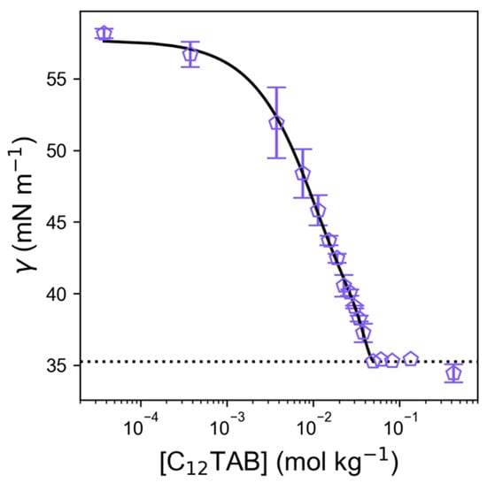 To determine whether the measured liquid region corresponds with a micellar (L1) phase, a dilute solution series of C12TAB in ChCl:EG was measured at room temperature (without specific environmental control) using pendant drop tensiometry, shown in Figure 3. Interestingly, the surface tension of the pure solvent measured via this method (58.2 mN m−1) is slightly higher than the value we measured using the Du Noüy ring method (54.7 mN m−1), likely due to differences in the techniques and laboratory conditions. The results show the typical sigmoidal plot expected from a surfactant solution. As a function of concentration, the surface tension gradient increases as the surfactant adsorbs at the air-DES interface, until reaching a plateau—the critical micelle concentration (CMC)—where the surface is saturated with surfactant, and self-assembly structures begin forming in the bulk []. From these measurements, the CMC for C12TAB in ChCl:EG was determined to be 44.7 mM (49.8 mmol kg−1, 1.2 wt.%), which is significantly higher than the value of 22 mM observed for C12TAB in ChCl:glycerol [], or of 15 mM in water [,], similar to the CMC observed in ChCl:malonic acid, 54 ± 6 mM [], but still much lower than the value recorded for the CMC in the ionic liquid (IL) ethylammonium nitrate (EAN), of 220 mM []. The limiting surface tension plateau at the CMC, γCMC, was observed to be 35.25 mNm−1, which is typical of linear hydrocarbon surfactants at aqueous interfaces []. To demonstrate that the interfacial composition is chemically modified, the surface tension data were fitted to the Gibbs adsorption isotherm, obtaining the gradient (i.e., the term at the CMC) through a quartic polynomial function (see fit line in Figure 3) []. From this, the Gibbs surface excess (Γ), which is the surface enrichment relative to the bulk, was calculated for this system as 2.04 µmol m−2. Further, the average area occupied per surfactant molecule was calculated to be 81.3 Å2 molecule−1. These values are comparable to those seen for various common surfactants in aqueous systems, confirming that there is no intrinsic difference in the composition of the adsorbed interfacial layer [], likely a surfactant monolayer, despite the fact that our ChCl:EG DES is a multicomponent protic solvent with high ionic strength [,,,]. The area per molecule is slightly higher than that observed for C12TAB or C12TANO3 in Ce(NO3)3.6H2O DES, which can be explained by the significant difference in the solvent composition, ionic strength, calculated Gordon parameters, and the method applied here to obtain the tangent [].