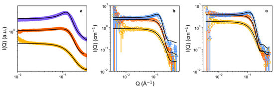 Measured and background-subtracted scattering data: (a) SAXS of C12TAB (5, 10, and 15 wt.%) in ethaline DES; (b) SANS of D-C12TAB (5, 10, and 20 wt.%) in H-ethaline DES; (c) SANS of H-C12TAB (5, 10, and 20 wt.%) in D-ethaline DES. Experimental surfactant concentrations are represented by yellow circles (5 wt.%), orange downwards triangles (10 wt.%), purple diamonds (15 wt.%), and blue upwards triangles (20 wt.%), whereas fits are shown as black lines. Data and fits are omitted where small-angle scattering could not be reliably fitted due to signal-to-noise ratio, i.e., for 2 wt.% samples of C12TAB.
