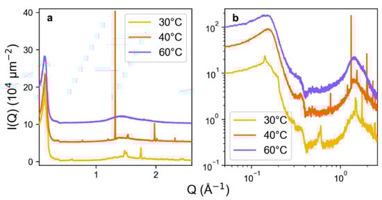 Next, we investigated the solid and mesophase regions of the phase diagram using SWAXS. Figure 5 shows results for 40 wt.% of C12TAB in ChCl:EG as a function of temperature. Samples of pure ChCl:EG and C12TAB powder were also measured as a reference and are shown in Figure S3. Features of note in the pure compounds are major Bragg peaks for C12TAB at 1.48 and 1.72 Å−1, and a broad ‘solvent structure’ peak corresponding with nearest-neighbour interactions within the DES, centred at 1.39 Å−1, similar to that found for similar ChCl DES [,]. All samples show evidence for the existence of micelles, with the low-Q scattering data agreeing well with the form and structure factors observed by synchrotron SAXS, and a Q−4 slope with prepeak centred at 0.14 Å−1, indicative of strongly interacting assemblies particularly evident in the Porod plot (Figure 5b). This S(Q) signal corresponds to a d-spacing (regular intermicellar separation) of 88 Å. When the system containing 40 wt.% C12TAB in ChCl:EG is held at 60 °C, only this low-Q peak, and the high-Q ChCl:EG intermolecular structuring peak, are observed. On the other end of the spectrum, measuring the system at 30 °C, which gives a semi-solid sample just below the measured solid–liquid phase transition, clearly shows the same series of Bragg peaks as in pure C12TAB, indicating the presence of undissolved, crystalline surfactant despite extensive equilibration of the sample. However, at this temperature it is also possible to observe small pseudo-Bragg peaks at 0.14 Å−1, 0.3 Å−1, and 0.6 Å−1, thus with relative peak positions of 1:2:4. These reciprocal space reflections are indicative of lamellar phase formation, where the ratio is typically 1:2:3:4 [], with the 3rd order peak hidden for our samples behind the prominent background scattering of the Kapton cell windows. Heating the sample to 40 °C reveals overwhelming scattering features at 1.32 Å−1 and 1.99 Å−1; d = 4.8 Å and 3.2 Å in real space, respectively, in an intensity ratio of ca. 7:1. These features could not be easily related to any of the common crystalline phases, including those of solid C12TAB. The known diffraction peaks of ChCl are close to these, however, the peak intensities do not match, and ChCl is also known to form co-crystals with small organic molecules [], giving powder patterns which can be indistinguishable from pure ChCl []. Moreover, crystalline α-ChCl is one of the most radiation-sensitive organic crystals known, while our SWAXS collection time is long (ca. 1–2 h), and these peaks were not observed at the lower temperature of 30 °C [,]. Therefore, these features are most likely either a co-crystalline, or solvent-expanded surfactant phase of C12TAB formed upon interaction with the DES [], containing ethylene glycol molecules and/or cholinium cations, with the cationic surfactant. Therefore, we present evidence for the formation of various phases across our observed mesophase region for C12TAB in ChCl:EG.