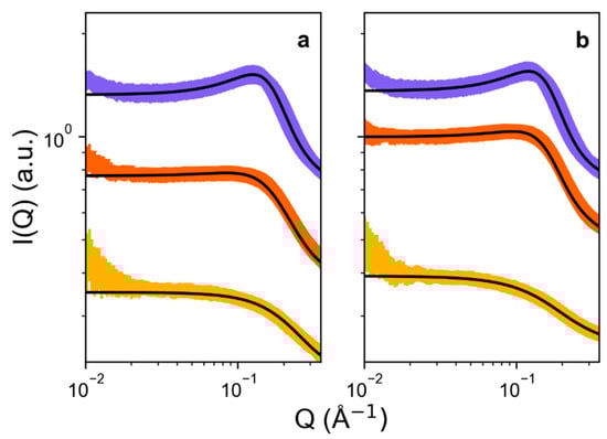 (a) SAXS of C12TAB (5, 10, and 15 wt.%) in 2-propethaline DES; (b) SAXS of C12TAB (5, 10, 15 wt.%) in 3-propethaline DES. Experimental surfactant concentrations are represented by yellow circles (5 wt.%), orange downwards triangles (10 wt.%), and purple diamonds (15 wt.%), and fits are shown as black lines. Data and fits are omitted where small-angle scattering could not be reliably fitted due to signal-to-noise ratio, i.e., for 2 wt.% samples of C12TAB.
