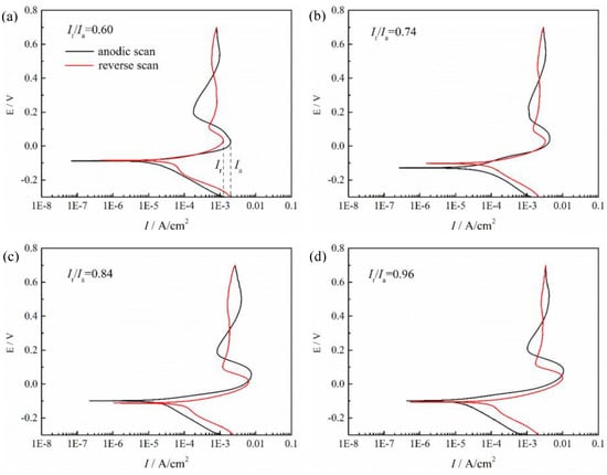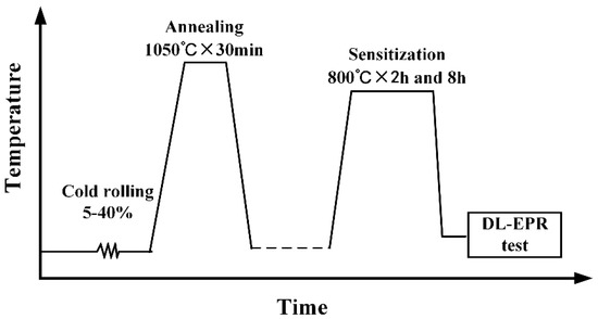 Specimens in 15 × 15 mm2 were machined from the sensitization treated samples and mechanically polished to assure the surface roughness of μm. The samples were then ultrasonically cleaned in acetone and kept in a vacuum desiccator before tests. A double-loop electrochemical potentiokinetic reaction (DL-EPR) test was performed to determine the IGC resistance. The electrolyte of a 4 mol/L HCl solution at a temperature of 50 °C was used, as it had already been optimized in a previous paper [26]. A saturated calomel electrode (SCE) is used as the reference electrode. The scan was started from the potential of −0.3 VSCE to the potential of 0.6 VSCE and then reversed to the beginning. The peak current densities in the anodic scan loop () and reverse scan loop () were determined from the DL-EPR curves. Then, the ratio of was defined as the degree of sensitization according to the GB/T 29088–2012. All tests were performed in triplicate to validate the obtained results.