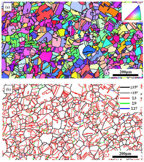 Figure 2 shows the microstructure, microtexture and grain boundary structure of the as-received C276 superalloy bar in a solid solution state. After solution treatment, uniform equiaxed grains with an average diameter of 42 μm were obtained. The inverse pole figure (IPF) map, which is colored by a stereographic triangle corresponding to crystallographic direction, depicts a very weak texture. Based on the quantitative data of crystal orientations obtained, the nature of the grain boundary and misorientation between adjacent grains can be calculated, as shown in Figure 2b. The low angle grain boundary (LAGB) is defined by a misorientation between adjacent grains , while HAGB is defined by . The main CSL boundaries, Σ3, Σ9 and Σ27, were also highlighted. Figure 2b depicts that the boundaries are mainly HAGBs with a few LAGBs and a certain number of CSL boundaries formed, in which the fraction of the Σ3 boundary is much higher than others. Some Σ3 boundaries are observed to terminate at the grain interiors.