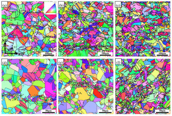 Figure 3 shows the IPF maps of the tested C276 superalloy after cold rolling and annealing. The microstructures mainly compose an equiaxed grain structure with a certain amount of twins in the grain interiors. Some bands along the rolling direction with small grains can be observed.