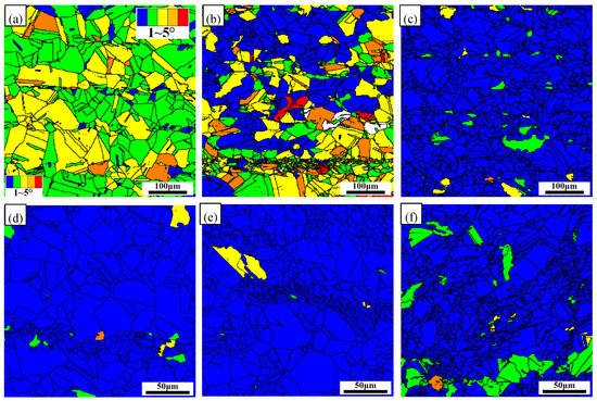 IPF maps of C276 superalloy annealed at 1050 °C for 30 min with different cold rolling reductions. (a) 5%, (b) 10%, (c) 15%, (d) 20%, (e) 30%, (f) 40%.