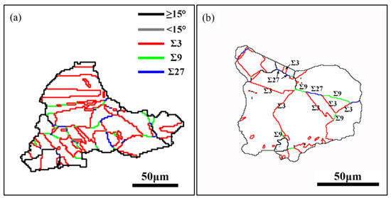 It was found that most of the Σ3n boundaries were incorporated to the HAGB networks as convoluted boundaries. Some big grain clusters can be defined, as marked in Figure 5c,d. To illustrate this more clearly, the marked areas were redrawn in Figure 9. The boundaries between grain-clusters are random HAGBs. In addition, the grains within the grain cluster have Σ3n relations. Xia et al. suggested that the formation of the grain cluster is beneficial for the improvement in mechanical properties of low SFE superalloys [19,31]. The interactions between Σ3n boundaries: Σ3 + Σ3 → Σ9 and Σ3 + Σ9 → Σ27, can be seen within the grain cluster.