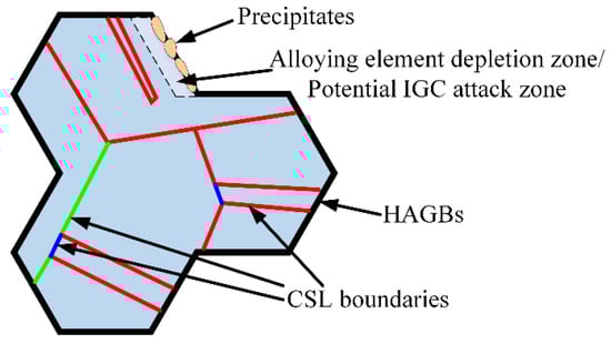 The degrees of sensitization () were different for the samples with 15% and 40% cold rolling reductions, as seen in Figure 8. It can be seen that the degree of sensitization is closely related to the precipitation behavior. With increasing the precipitates formed at grain boundaries, the IGC attacks became much more severe. The precipitation at the grain boundaries would result in a Mo/W depletion zone adjacent to the grain boundaries. These depletion zones were easily IGC attacked in the electrochemical test. Thus, the relation between the GBCD and IGC behavior for the C276 superalloy can be schematically illustrated in Figure 10. Similar Cr depletion near the grain boundaries due to the precipitation of carbides is known to deteriorate the IGC resistance of stainless steel [35].
