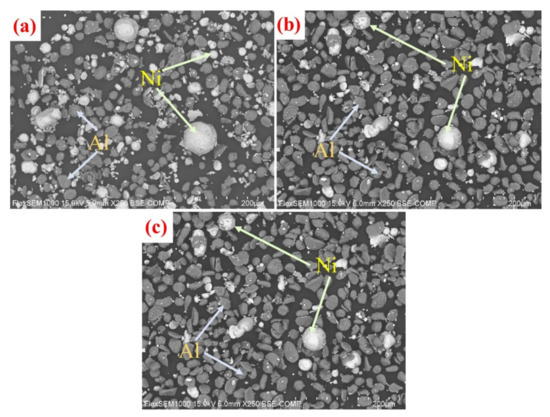 Figure 1 shows the morphology of the Ni/Al energetic structural material mixed powders with different molar ratios of 1:1, 1:3, and 3:1. It can be seen that by the mixed and ball milling technique, the Ni and Al particles were randomly dispersed, where the bright particle was Ni and the dark particle was Al.