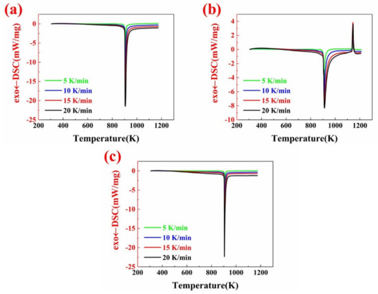 The DSC curves of Ni/Al energetic structural materials with the molar ratios 1:1, 1:3, and 3:1 at different heating rates are shown in Figure 2. For Ni/Al = 1:1, only one exothermic peak occurred during the thermal reaction process from room temperature to 1200 K, which were located at the range from ~870 K to ~950 K. In the DSC curves of Ni/Al = 1:3, two peaks, referring to an exothermic peak at ~900 K and endothermic peak at ~1150 K, appeared in Figure 2b. The exothermic peak represented the thermal reaction of Ni/Al, which was consistent with that of Ni/Al = 1:1 in Figure 2a. The endothermic peak was attributed to the melting process of NiAl3, which was further discussed in XRD results. n addition, the DSC curves of Ni/Al = 3:1 are shown in Figure 2c. The thermal reaction processes between Ni and Al were seen at the exothermic peak.