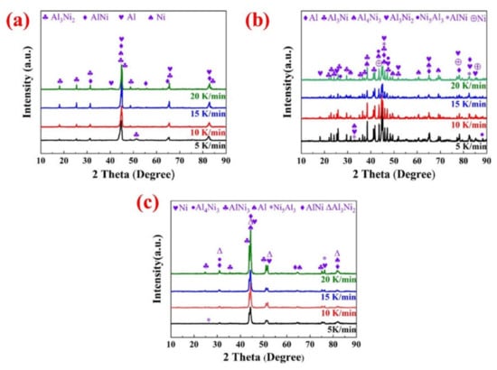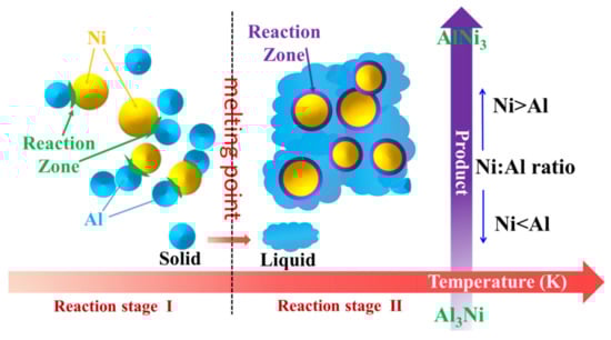 Different Ni and Al molar ratios will lead to different chemical reactions. Theoretically, when the molar ratio of Ni and Al is 1:1, 1:3, and 3:1, the corresponding apparent reaction is shown in the Equations (1)–(3), respectively [21].