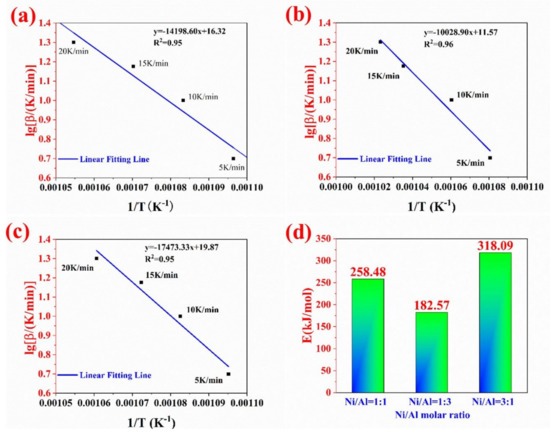 Linear fitting of samples at different heating rates (a) Ni/Al = 1:1, (b) Ni/Al = 1:3, and (c) Ni/Al = 3:1; (d) the apparent activation energy E of the samples.