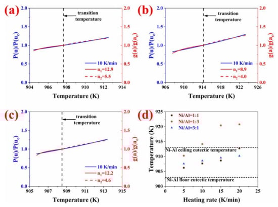 Figure 5a–c show the fitting results of the test reaction curve at the heating rate 10 K/min. The two reaction curves revealed a good fitting effect. For the other heating rate conditions, it had a similar trend. In order to explore the mechanism on the occurrence of transition temperature, the transition data points of the samples are plotted in Figure 5d. It could be found that the transition temperature points were distributed in the Ni/Al liquid eutectic temperature range, which indicated that the transition from solid state to liquid state of Al was the critical factor, although the discrepancy was presented due to the reaction hysteresis at the high heating rates for Ni/Al = 1:3.