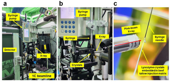 Pink-beam SSX data collection was performed at the 1C beamline at the PLS-II. A syringe and syringe-pump-based sample delivery approach was applied to deliver the microcrystals to the X-ray interaction point. The syringe pump and syringe were installed in the vertical direction on three manually adjustable laboratory jacks (Figure 1a,b). Lysozyme crystals were used as model samples to demonstrate and evaluate diffraction quality. To reduce the sample consumption, a viscous medium-based sample delivery method was applied. Lysozyme crystals were embedded in a beef tallow injection matrix to deliver crystals to the X-ray beam path in a stable and serial manner and at a low flow rate. This beef tallow produced a stable injection stream, even at a flow rate of <1 nL/min. However, if microcrystals were delivered to the X-ray interaction point at a low flow rate, the microcrystals were exposed to X-rays several times and for long durations due to the X-ray beam size. To reduce the multiple exposures of the microcrystals, these were delivered to the X-ray interaction point at a flow rate of 1 μL/min (Figure 1c). The width of the injection stream was approximately 300 μm. The sample injection stream was aligned to the X-ray beam path using a visual camera (Figure 1c).