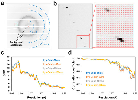 The Bragg peaks showed a slightly stretched shape for all diffraction datasets while using pink-beam X-rays (Figure 2a,b). Background scattering signals of beef tallow were observed at 14.5, 4.8–4.2, and 3.8 Å (Figure 2a), which are identical to our previous report [18]. Statistical analyses of 25,000 diffraction patterns from the four datasets were performed. In the low-resolution region (beam center to 3.5 Å), where beef tallow injection background scattering is observed, the SNR of the data of the edge exposure was 10–20% higher than that of the data of the center exposure (Figure 2c). This indicated that exposing X-rays to a thin area in the injection stream reduced the background scattering and improved the SNR. However, no significant difference in the SNR was observed between the exposure times of 50 ms and 100 ms (Figure 2c). In contrast, the exposure time of 100 ms showed improved CC within a 2 Å resolution compared to the exposure time of 50 ms (Figure 2d). Meanwhile, the statistical analyses of the entire dataset revealed that there is less than a 10% difference in the SNR, CC, CC*, and Rsplit among the data.