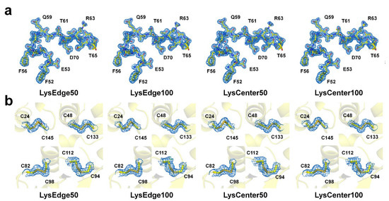 All the amino acids, including the lysozyme side chains, from the four datasets were almost clearly observed in the electron density maps (Figure 3a), showing that there was no difference in the quality of the visually observed electron density maps (Figure 3a). The Rwork and Rfree values of the data exposed to X-rays for 50 ms (Rwork/Rfree, 21.14/23.15 for LysEdge50 and 21.77/23.41 for LysCenter50) showed lower values than the samples exposed to X-rays for 100 ms (22.55/25.63 for LysEdge100 and 22.73/25.64 for LysCenter100) (Table 2). In the lysozyme structure, eight cysteine residues form four disulfide bonds (C24–C145, C48–C133, C82–C98, and C94–C112). The sulfur in cysteine is relatively sensitive to radiation damage because of its high atomic number compared to other amino acid atoms [26]. In particular, when a specific X-ray dose limit was exceeded for lysozyme crystals, specific radiation damage was observed, in which a negative electron density peak appeared in the Cys6-Csy127 disulfide bond at cryogenic or room temperature [26,27]. To determine whether radiation damage occurred, electron density maps for 2mFo-DFc and mFo-DFc for the disulfide bond of lysozyme were analyzed. No significantly negative electron density map was observed for the disulfide bonds of all lysozyme datasets (Figure 3b).