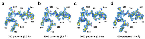 The number of reflection intensities using a non-monochromatic broad-bandpass beam is significantly higher than those using monochromatic radiation, indicating that pink-beam SSX reduces the data collection time and sample consumption when compared to SSX using monochromatic radiation [16,28]. We examined the minimal images to obtain reliable structures by reprocessing the collected LysEdge50 dataset. Data resolution was cut off when overall CC* and SNR were >0.9 (high resolution shell: >0.4) and >1, respectively. When the diffraction pattern was <600, the overall CC* did not reach 0.9.