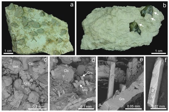 (a) “Achtarandite” crystals on the surface of a grossular–diopside–chlorite rodingite-like rock with an admixture of minerals of the kaolinite–serpentine group; (b) grossular crystals with epitaxial overgrowths of “achtarandite” (arrows) in rodingite-like rock; (c,d) minerals of the internal part of sponge achtarandite pseudomorphs, BSE; (c) splitting (H4O4)4−-substituted, B-bearing vesuvianite crystals and octahedral grossular-katoite crystals; (d) short-prismatic crystals of hydrogrossular; (e) long-prismatic hydrogrossular crystal elongated along [110]; (f) prismatic hydrogarnet crystal elongated along the [111] direction used for the single-crystal X-ray diffraction study.