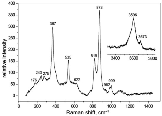 The weak bands at 176, 243, and 275 cm−1 are assigned to the lattice vibrations. The strength at 367 cm−1 is attributed to the symmetric bending Si–O vibrations of the (SiO4)4− group. A relatively intense band at 535 cm−1 and a weak band at 622 cm−1 are related to the antisymmetric bending Si-O vibrations of (SiO4)4− or overlapping stretching Al-O vibrations of AlO6 octahedra [43]. A weak and broad band at 622 cm−1 also can be assigned to the hydroxyl deformation (librational) mode [50,54,55,56]. The doublet of intense bands at 819 and 873 cm−1 is assigned to symmetric Si–O stretching modes of (SiO4)4−. A weak split peak with two maxima at 982 and 999 cm−1 is related to antisymmetric stretching Si–O vibrations [48].