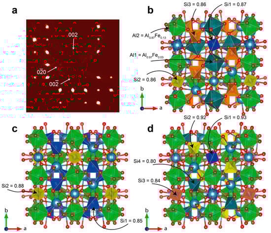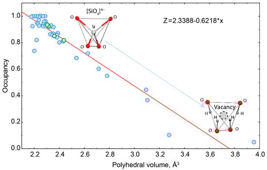 The location of different Z sites for both tetragonal models is shown in Figure 4a,b. It should be noted that the maximal occupancy difference of the Z sites 0.93 and 0.80 observed for the Id model indicates ordering of H4O4 defects at Z sites. For the I41/a model, its occupancies are 0.86 and 0.87. According to our experimental data, the polyhedral volume of Z sites depends from the occupancy or, in other words, the amount of (H4O4)4−↔ (SiO4)4− substitution (Figure 5).