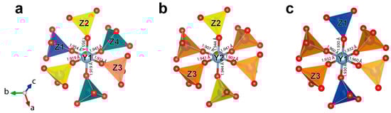 According to our data refinement in the I41/acd space group, the occupancy of both tetrahedral sites (Si10.86□0.14)1.00 and (Si20.87□0.13)1.00 is very close and does not explain symmetry lowering from cubic to tetragonal. The Y–O distances vary in the range of 1.907–1.960 Å and are not correlated with the occupancy of Z sites (Figure 6b,c).